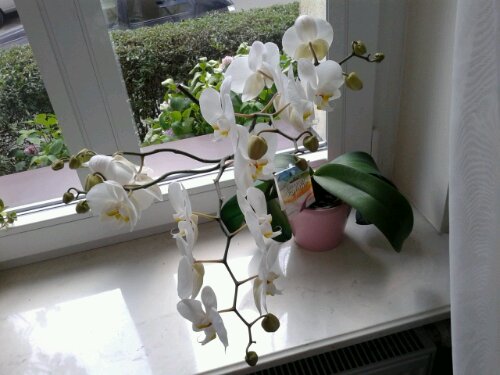 Też dostaliśmy kwiaty… Wiele pięknych kwiatów: ogromny, niecodzienny kwiatostan białego storczyka, Krzysiowego storczyka. Mamy w domu siedem innych tych samych kwiatów, z pięknymi pąkami, na pojedynczej łodydze. Na tym storczyko-drzewku doliczamy się rozkwitniętych 5-ciu łodyg… A dlaczego to takie ważne? I dlaczego to Krzysiowy storczyk? A ponieważ został zakupiony w momencie urządzania kącika Krzysia w naszej sypialni i wprowadzaniu tam elementów błękitu, kiedy to mogliśmy tej aranżacji poświęcić wiele czasu, wyczekując upragnionego powrotu synka do domu ze szpitala. Storczyk był początkowo pięknie niebieski (widać farbowany, bo teraz jest biały), a zaraz po jego pojawieniu się u nas, pojawił się Krzyś.