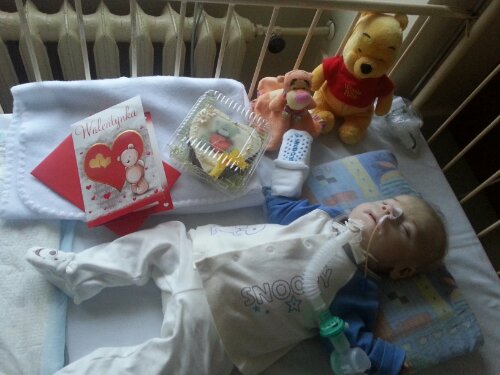 „W południe sobie smacznie spałem, ale mama mnie rozzłościła nauką ssania – nie lubiem bardzo jak mi ktoś coś wsadza do buzi, bo boję się strasznie, że to znowu rura od respiratora… Oddycham siam, tlen 0,2 l/min (maluśko). Jem też superowo: pochłaniam swoje porcje w pół godzinki! Jak zdrowe dzieci prawie… bo ciągle przez sondę. Jak tylko mam bardziej markotne momenty, to mama mnie bierze pionowo na rączki, mocno przytula i już jest lepiej. Od kilku dni mam zmienione leczenie neurologiczne: efekt pozytywny, póki co – brak drgawek. Wieczorem rodzice po raz pierwszy mnie kąpali w wanience! Było mydełko, szampon, potem oliwkowanie, pieszczuchanie… I taki wypachniony i wystrojony usnąłem sobie spokojnie podczas inhalacji.”