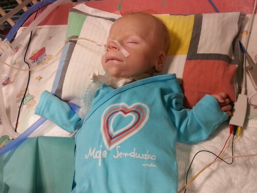 Dziś z okazji 6-miesięcznych urodzin Krzysia dobra wiadomość od kardiologów – druga dziurka w serduszku się zarasta i może Krzyś będzie miał kiedyś serce zdrowe jak dzwon… (no może nie jak dzwon Zygmunta, ale przynajmniej jak mały dzwoneczek 🙂 ). Na tą okazję synek ubrał oczywiście stosowne wdzianko (patrz: zdjęcie, ciekawe czy kardiolog wykonujący echo serca pozazdroscił mu takiej bluzy? 🙂 ). No i nasz dzielny synek został dziś przełączony na respirator domowy – trzymajcie kciuki, żeby na nim jak najdłużej wytrzymał!
